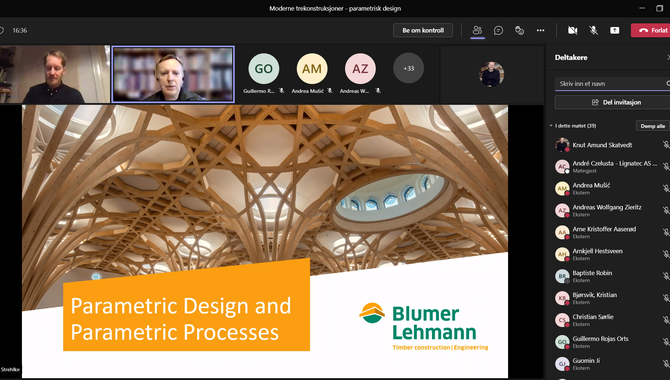 Kursene, som er lagt til fire formiddager, har dreid seg om; - ombruk, parametrisk design, og akustikk. Siste undervisningsdag er 2. februar og temaet er knutepunkter og hybride konstruksjoner. Det er fortsatt mulighet til å melde seg på hos Tekna .